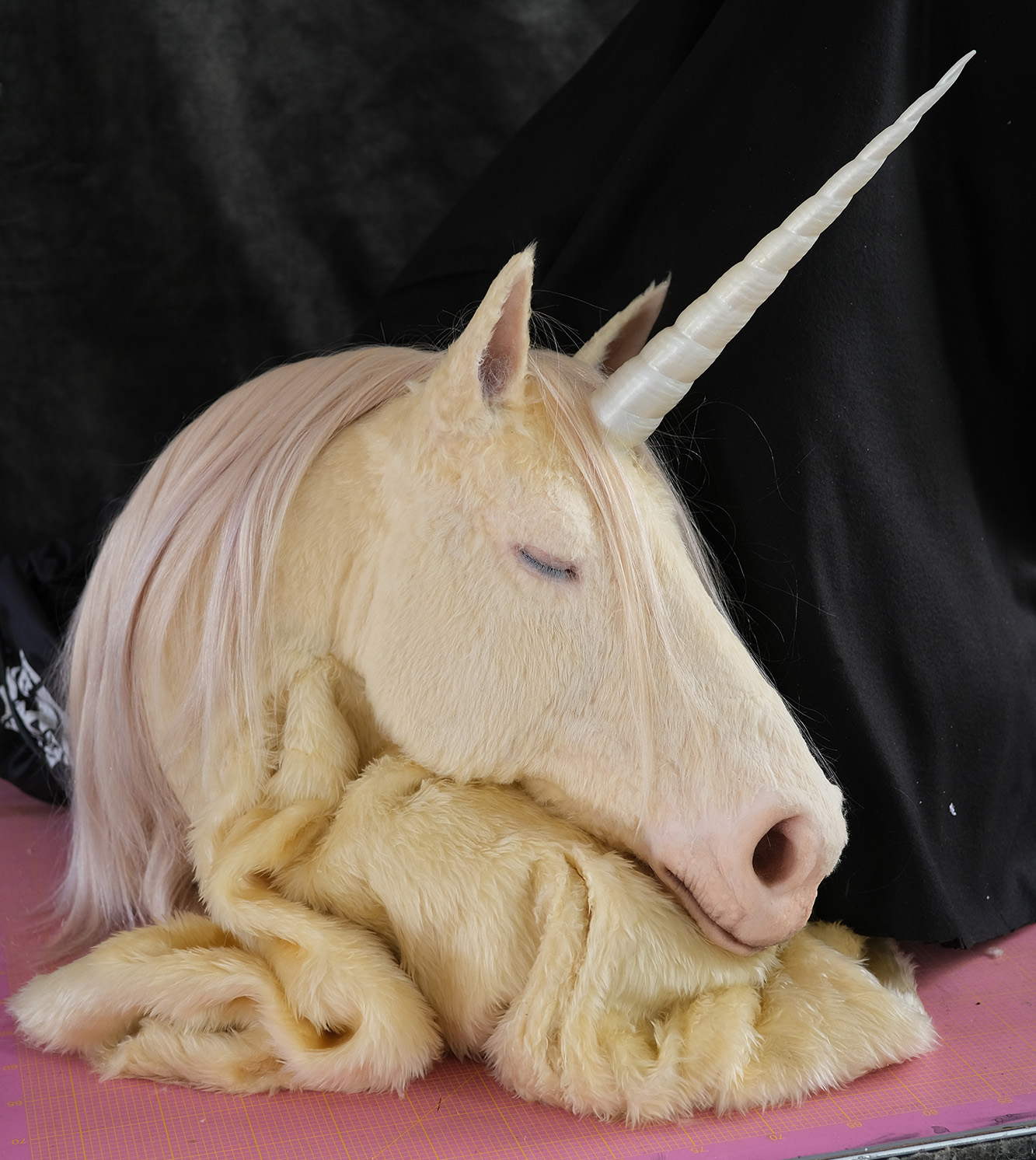 Einhornkopf befestigt auf unechtem Pelzmantel für Danny Reinkes S/S 26 Kollektion „The Hunt“. Modelliert, Abguss in Schaum/Silikon mit einer Mischung aus Echthaar und Webpelz. Horn aus Kunstharz.