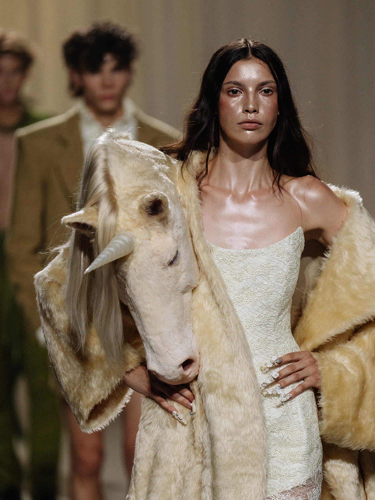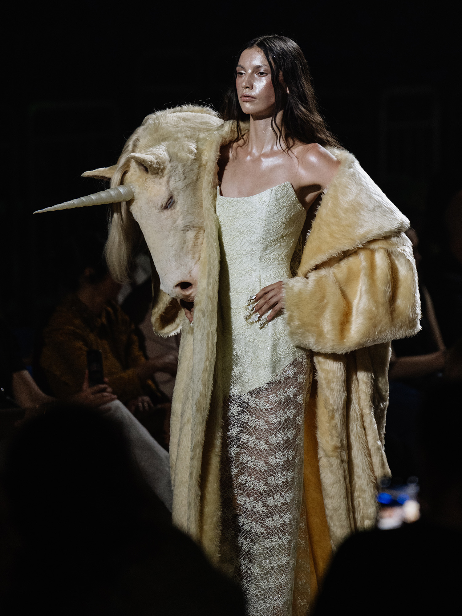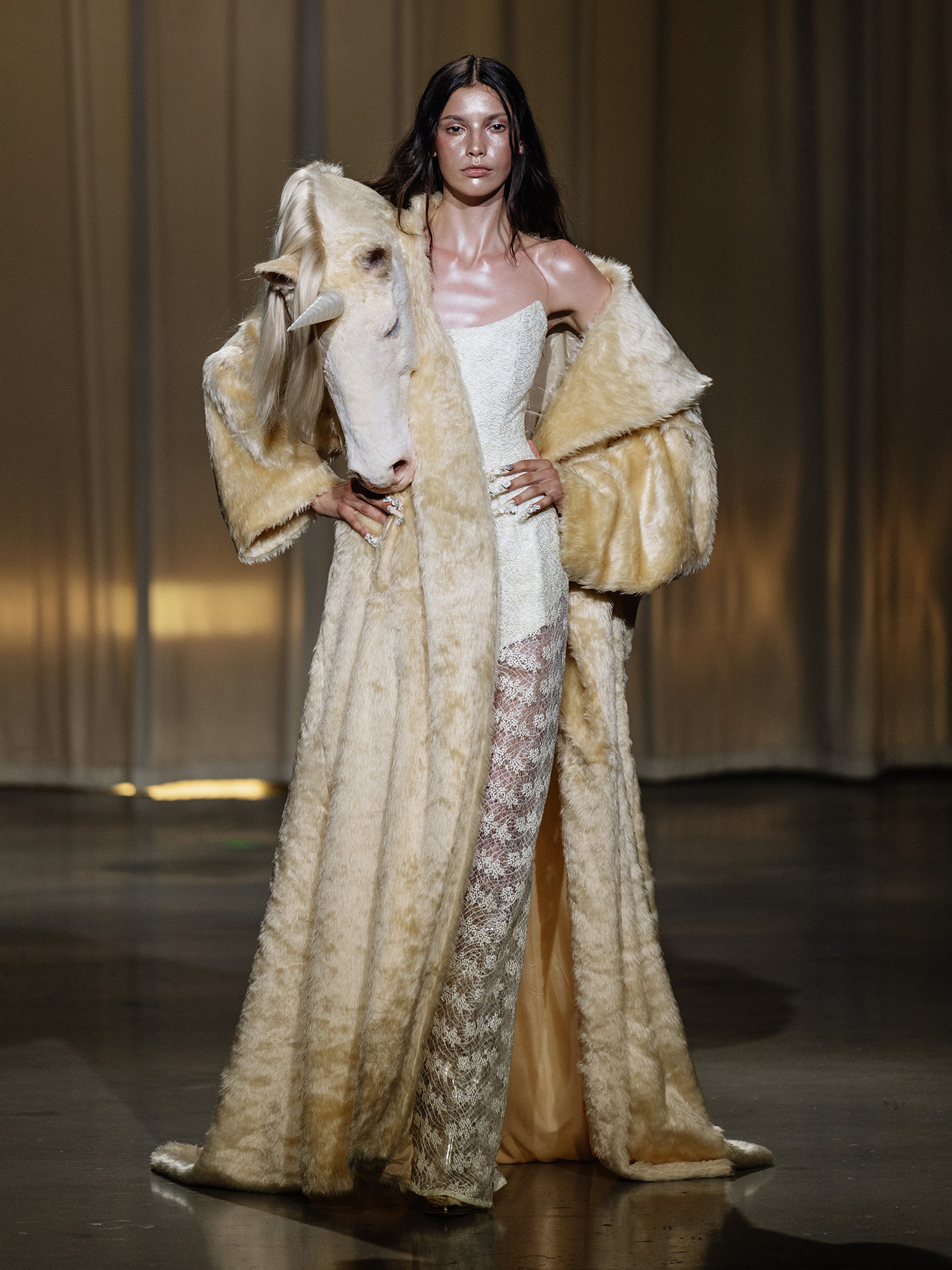 Unicorn head mounted on fake fur coat for Danny Reinkes S/S 26 collection „The Hunt“. Sculpted, casted in Foam/Silicone with a mixture of real human hair and fake fur, resin casted horn.
